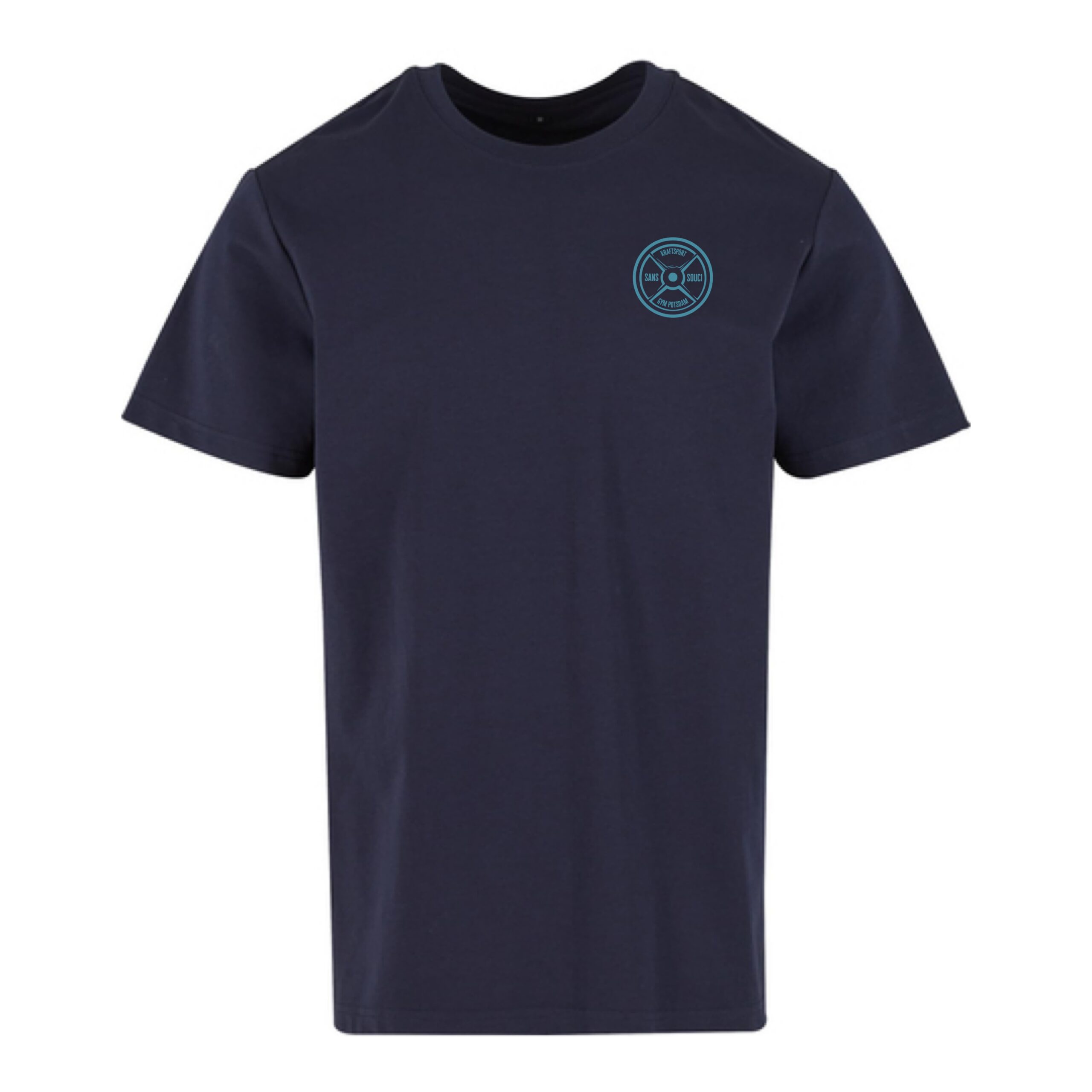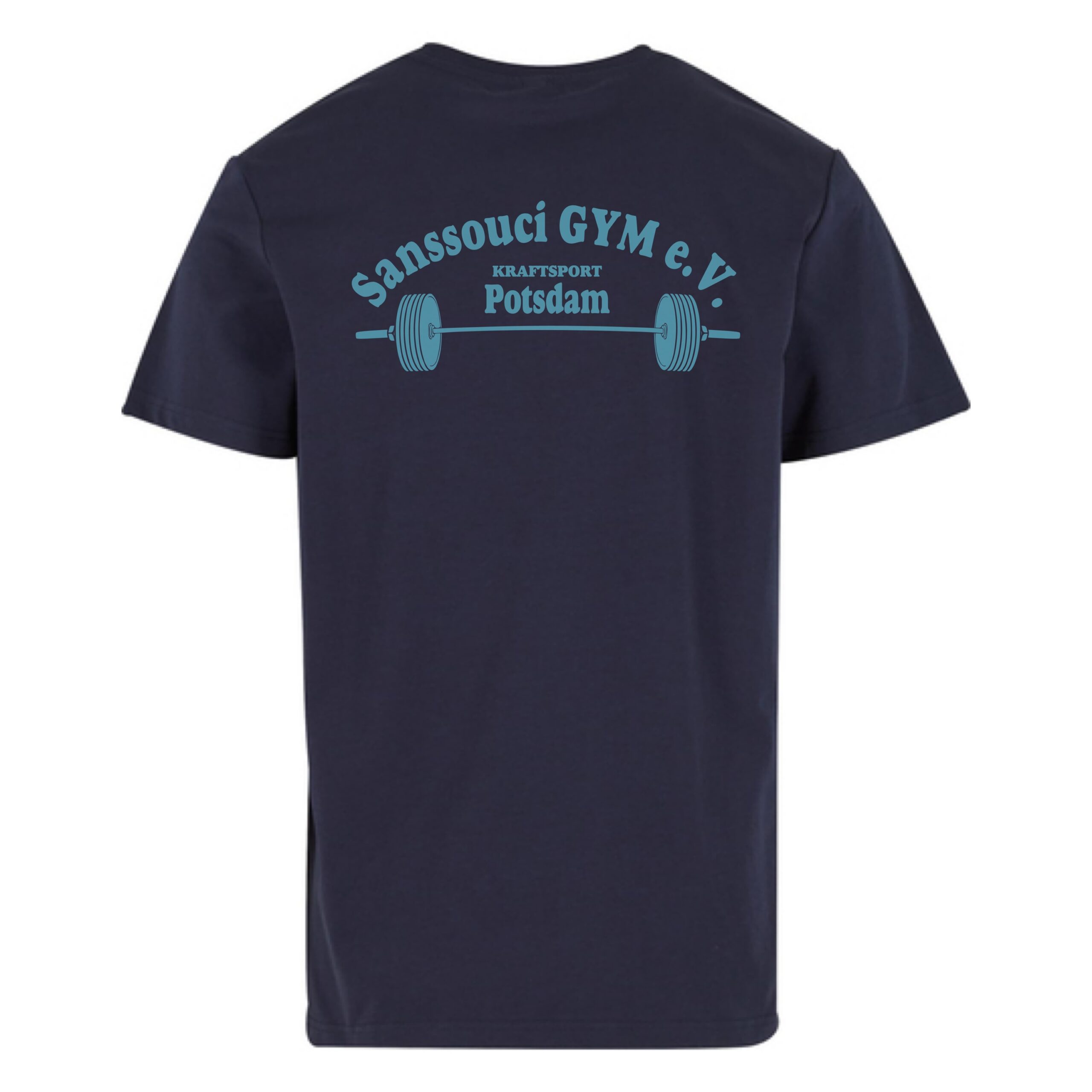 Handbedrucktes Vereinsshirt im Regular Fit aus nachhaltiger Sorona-Faser – direkt aus Potsdam für das Sanssouci Gym. Erhältlich in dunkelblau und grau.
